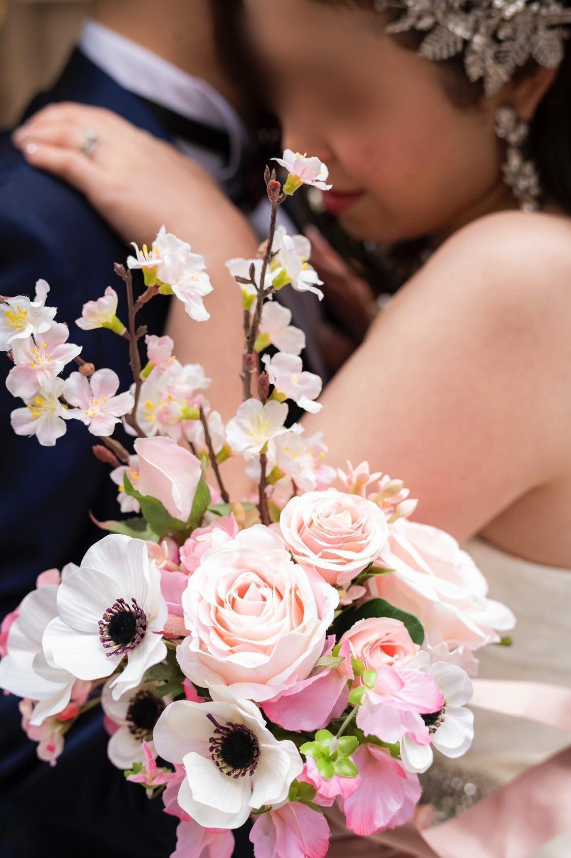 さくらと薔薇をメインに束ねたミニブーケです。花嫁さまに人気のアネモネも入って、ふんわりヒラヒラした感じがとても可愛いブーケです。