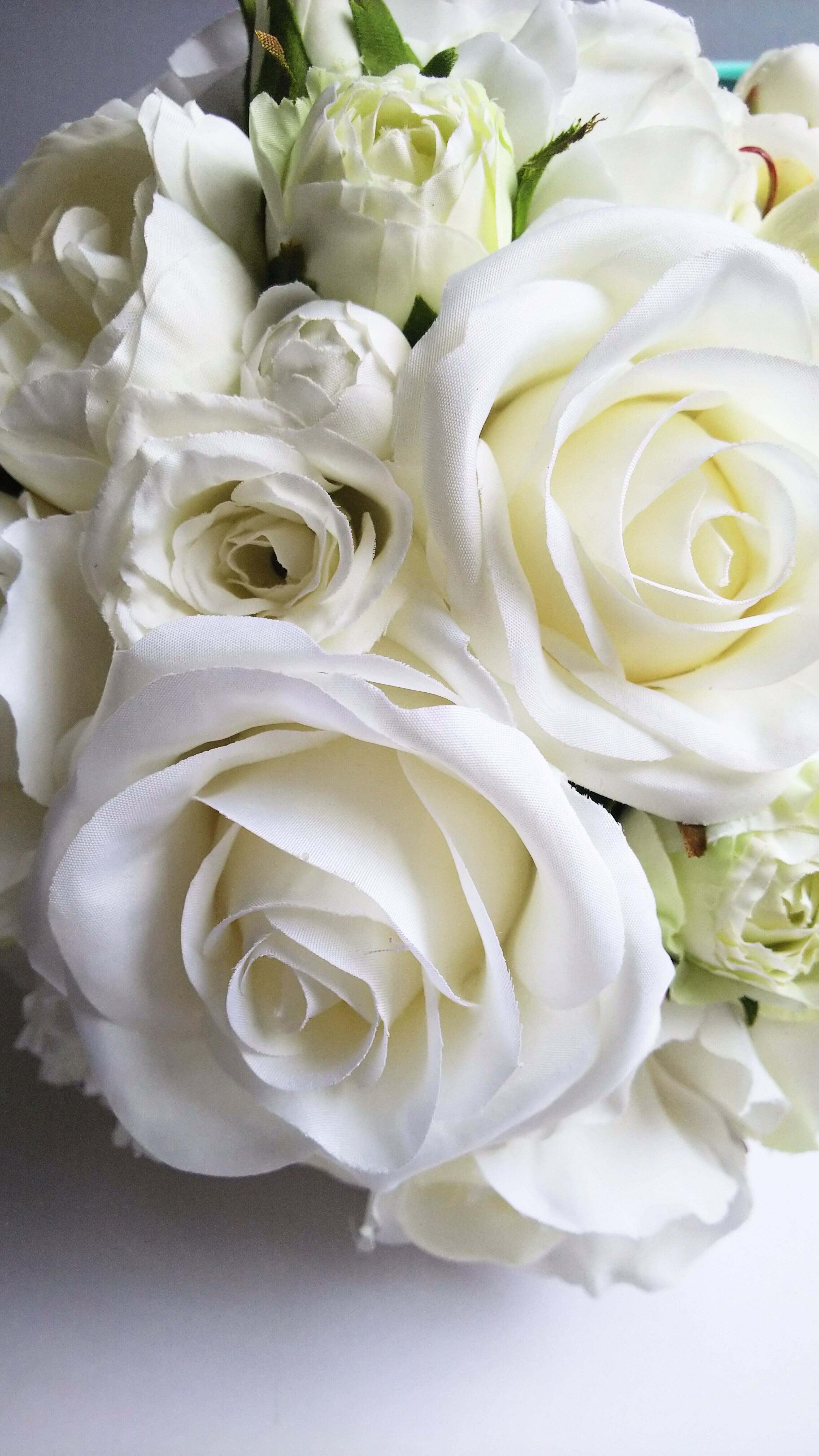 白い薔薇だけを集めたラウンドブーケです。単一の種類の薔薇を集めたブーケも素敵ですが、こちらはたくさんの種類の白い薔薇を集めて表情豊かに仕上げました。